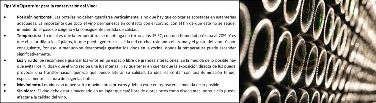 También hay que tener en cuenta a la hora de buscar la ubicación, no debe estar cerca de productos de limpieza, tóxicos, etc, para que no capte olores y así deteriore su sabor. Busque siempre aislarlo de estos productos. Por último, siempre que posea un corcho es recomendable que se coloque en posición horizontal. Así se conseguirá que el tapón siga húmedo, de lo contrario se puede secar y así encoger, permitiendo que el aire entre en la botella.