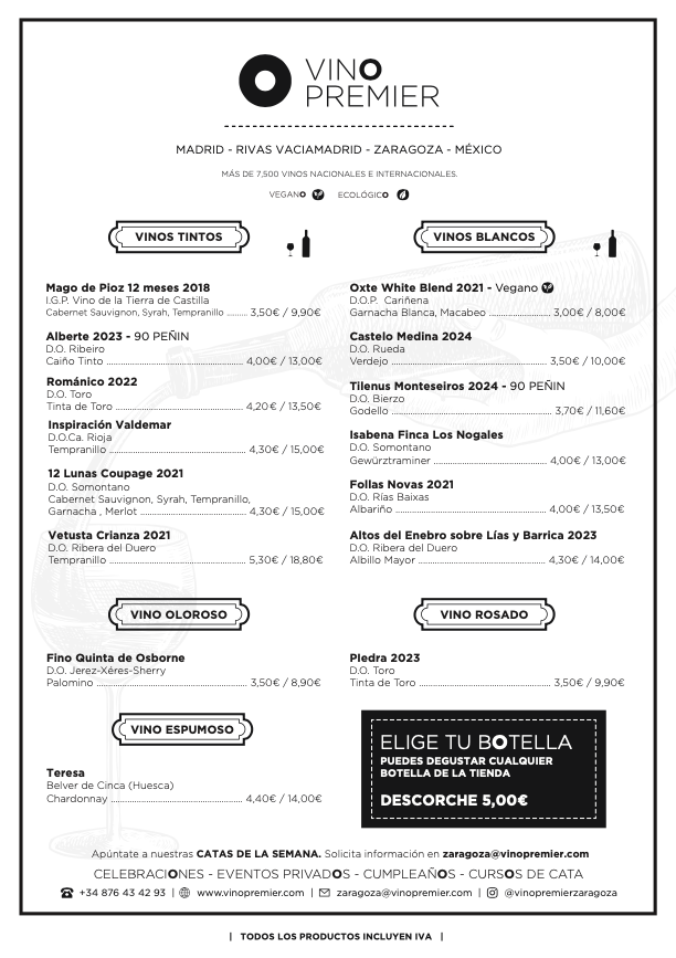 Carta de vinos y raciones Vinopremier Zaragoza